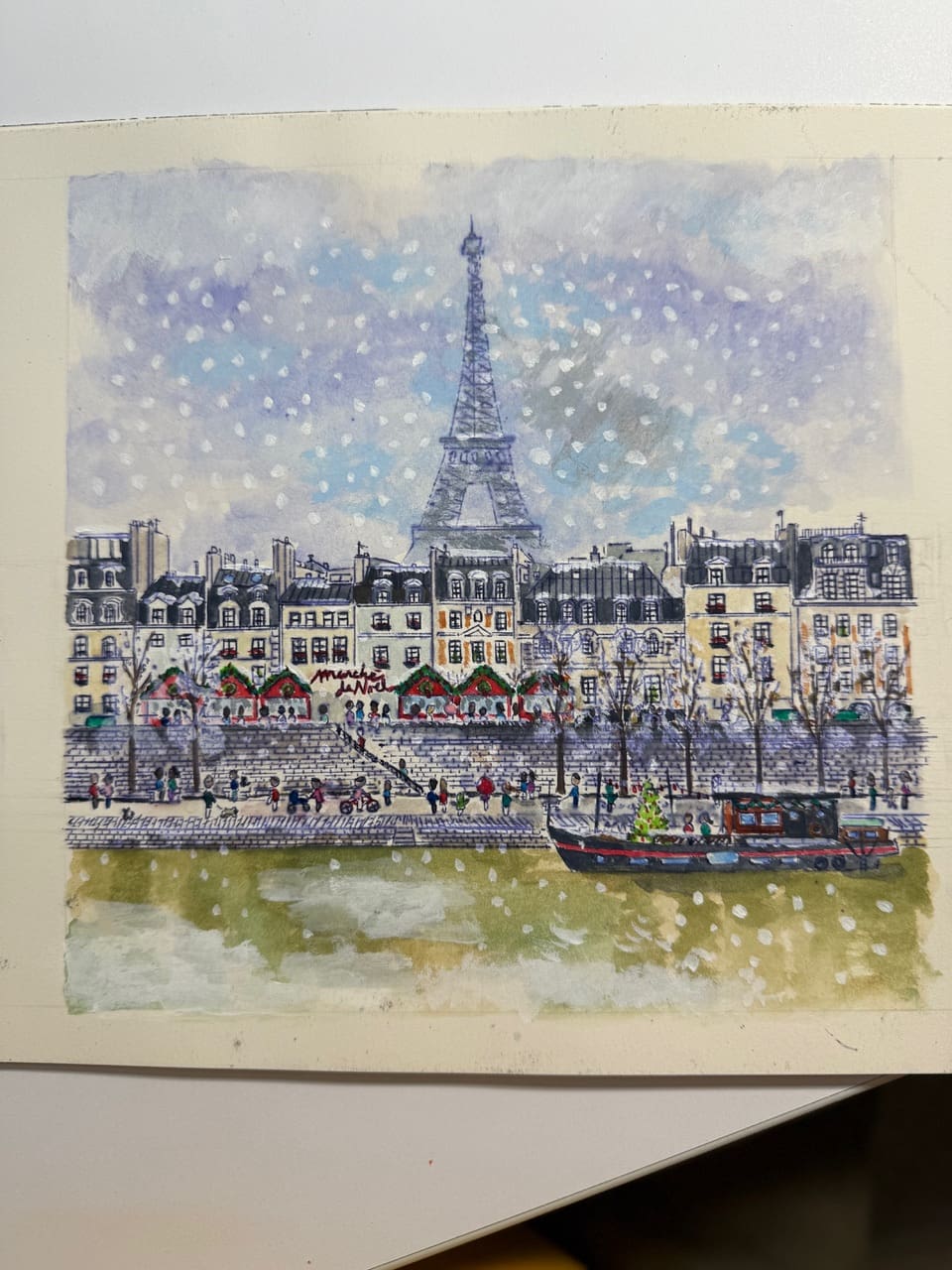 Eiffel Tower and the Seine Original Art. Watercolor and ink. Approximately 8”x8” on 9”x12” watercolor paper. This artwork comes unmatted. The copyright of this picture is retained by the artist, Michael Storrings, who reserves all rights. Buyer may not reproduce this image in any form for any purpose.