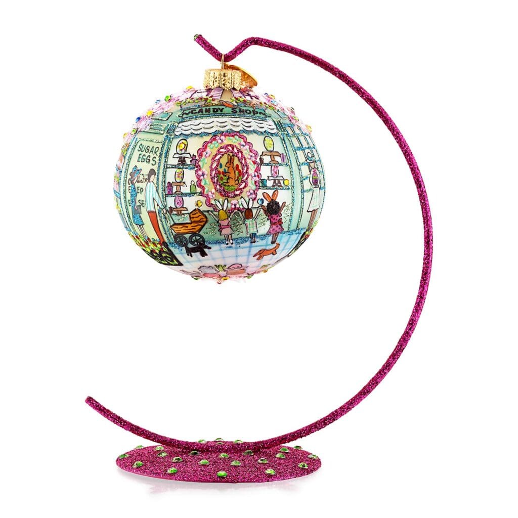 Halloween Ornament with Stand. Signed and Numbered Limited Edition of 3. This is for 1 of the 3 signed and numbered Michael Storrings Platinum Limited Edition Ornament. It is handpainted and handblown glass, imported from Poland, and approximately 4″ in diameter. Spot clean. Please allow one week for shipment.