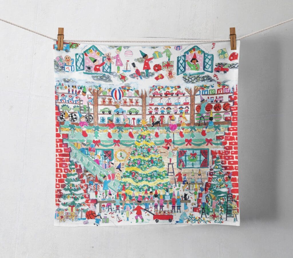 This Santa’s Toy Shop Large Round Tray is perfect for your holiday entertaining! Made in Finland of FSC-certified birch wood and coated with a matte layer of melamine. The tray is 15.7″ in diameter. Not microwave-safe and not dishwasher-safe.